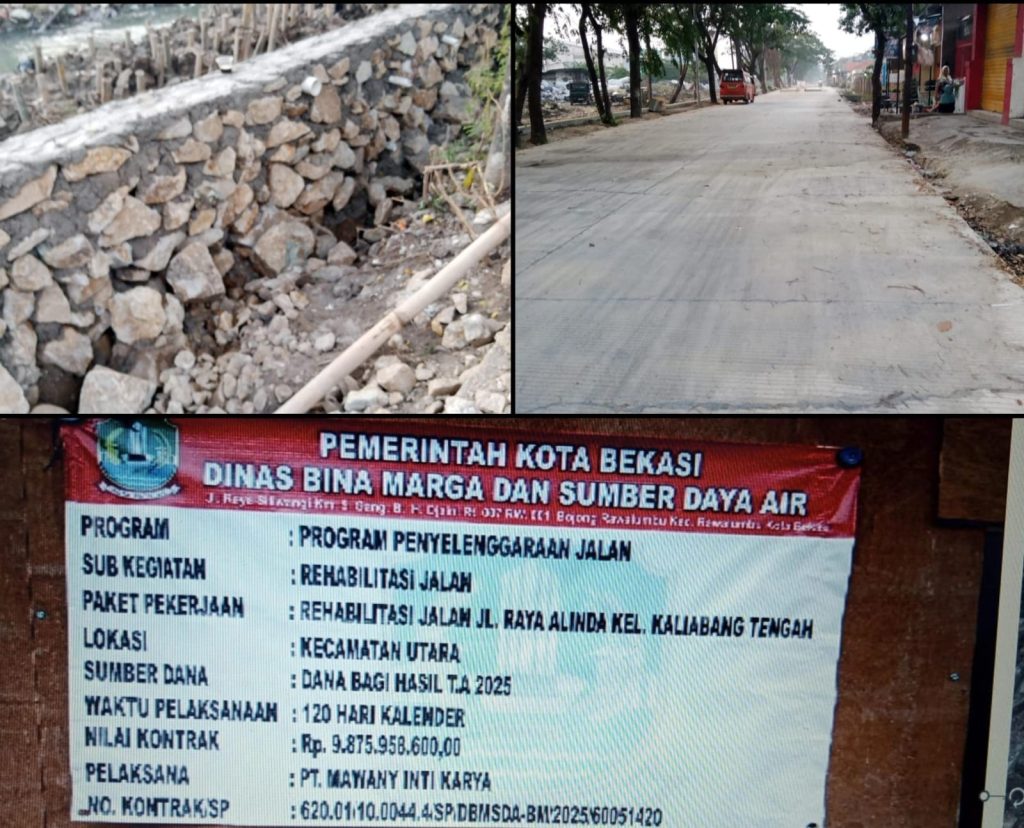 Masih dengan pantauan Media, untuk di ketahui public bahwa Proyek Rehabilitasi jalan, di Jalan Raya Alinda, Kelurahan Kaliabang Tengah, Kecamatan Bekasi Utara, sebagaimana tertulis di papan proyek yaitu untuk pengerjaan Pengecoran jalan dan pekerjaan turap, yang mana bahwa pekerjaan tersebut merupakan program prioritas Pemerintah Kota Bekasi melalui DBMSDA sebagai Pengguna Anggaran.
