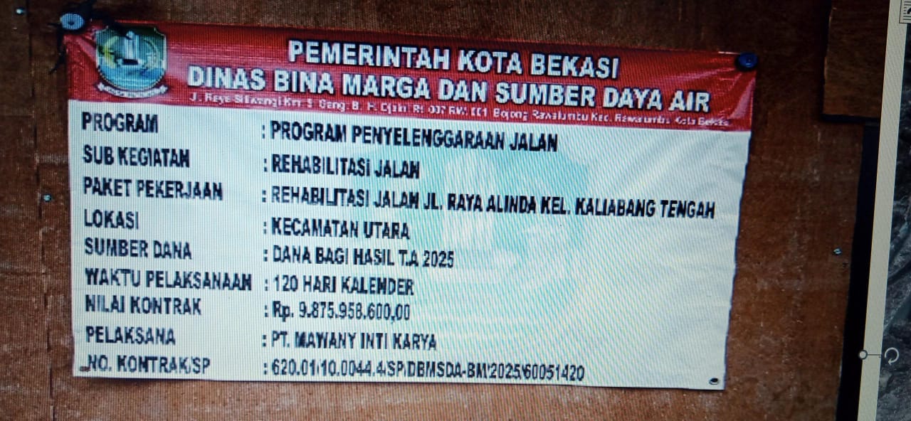 Masih dengan pantauan Media, untuk di ketahui public bahwa Proyek Rehabilitasi jalan, di Jalan Raya Alinda, Kelurahan Kaliabang Tengah, Kecamatan Bekasi Utara, sebagaimana tertulis di papan proyek yaitu untuk pengerjaan Pengecoran jalan dan pekerjaan turap, yang mana bahwa pekerjaan tersebut merupakan program prioritas Pemerintah Kota Bekasi melalui DBMSDA sebagai Pengguna Anggaran.