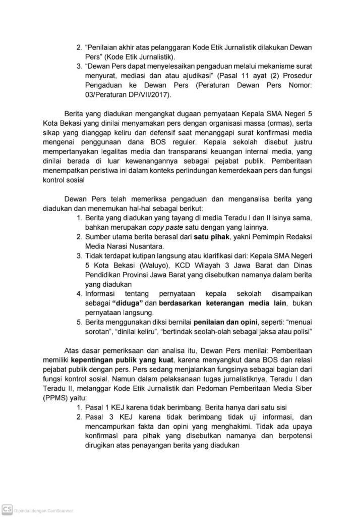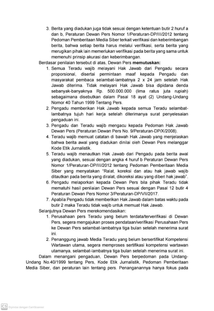 Dewan Pers menilai berita awal yang diadukan melanggar Kode Etik Jurnalistik. Pemuatan Hak Jawab ini merupakan kewajiban hukum sebagaimana diatur dalam Pasal 18 ayat (2) Undang-Undang Nomor 40 Tahun 1999 tentang Pers.