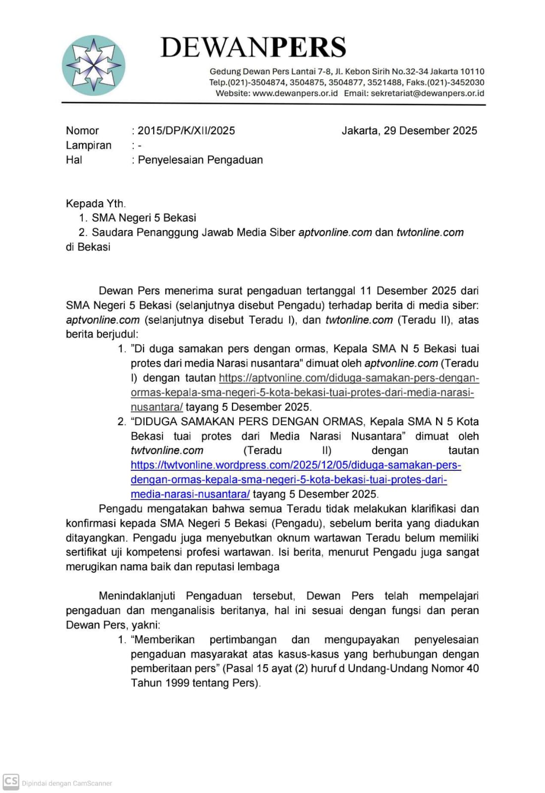 Terkait Berita: “Di duga samakan pers dengan ormas, Kepala SMA N 5 Bekasi tuai protes dari media Narasi nusantara” (Tayang 5 Desember 2025).