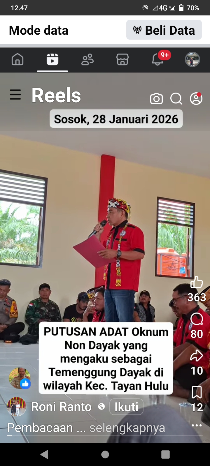 Ketua Dewan Adat Dayak (DAD) Kecamatan Tayan Hulu Yosef Heryanto diduga menggiring opini publik melalui media sosial yang memojokkan Jungkarnain Sagala, S.H. yang sedang memperjuangkan tanah adat Dayak Peruwan.