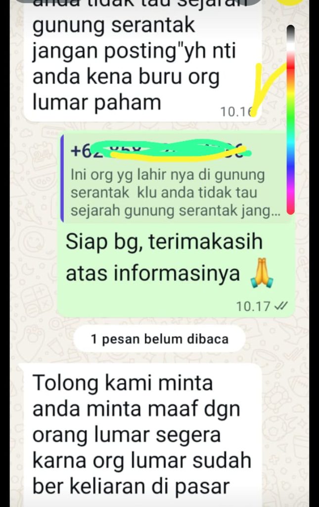 “Ini orang yang lahir nya di gunung serantak, kalau anda tidak tau sejarah gunung serantak jangan posting yah, NANTI ANDA KENA BURU ORANG LUMAR , Paham”‘ ketus orang itu