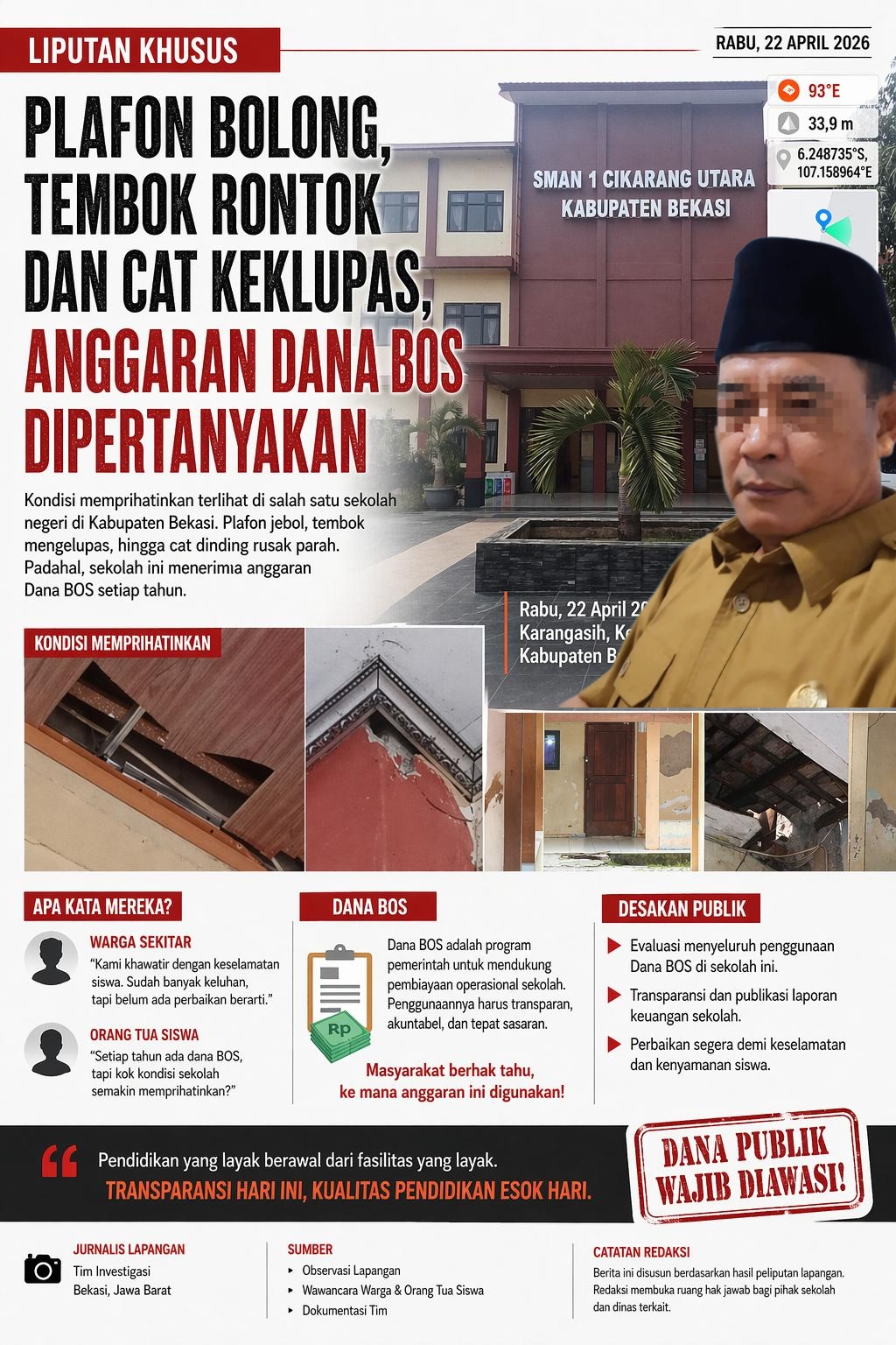 Dugaan ketidaktransparanan pengelolaan Dana Bantuan Operasional Sekolah (BOS) kembali menjadi sorotan di dunia pendidikan. Kali ini, perhatian tertuju pada SMA Negeri 1 Cikarang Utara yang berlokasi di Jalan Ki Hajar Dewantara No.23, Karangasih, Kecamatan Cikarang Utara, Kabupaten Bekasi.