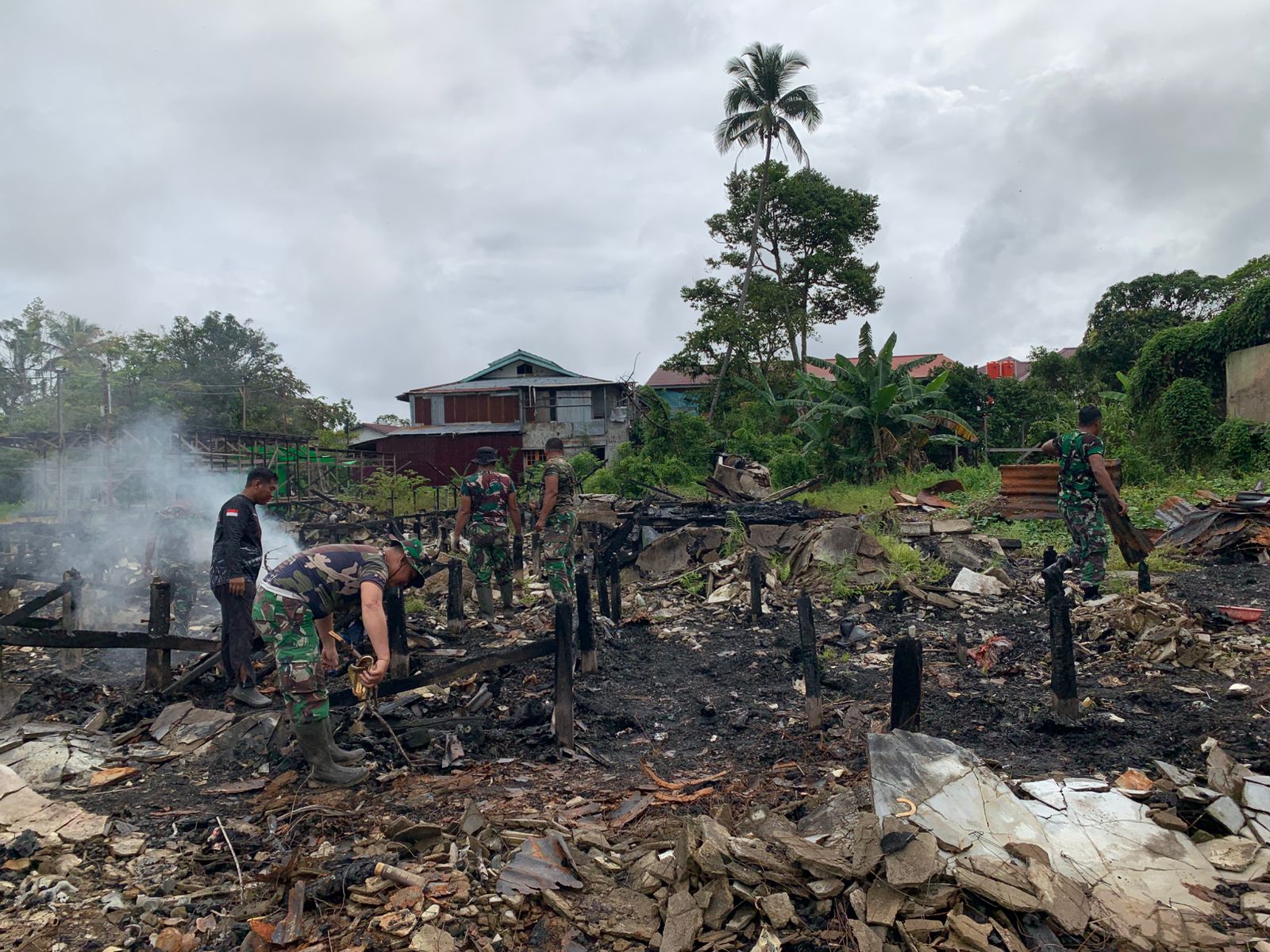 Koramil 1206-06/Putussibau Utara Gotong Royong Bersihkan Sisa-Sisa Puing Pasar Pagi Yang Kebakaran.