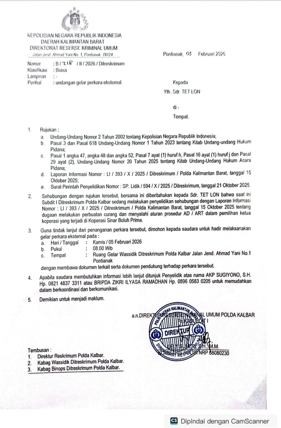 Hal tersebut dikatakan oleh Arbudin selaku Ketua LSM Somasi kepada awak media hari ini setelah menerima laporan langsung dari anggota Koperasi Sinar Boluh Prima (SBP) yang menghadiri gelar perkara kasus ini pada hari Kamis tanggal 5 Februari 2026 kemarin di Polda Kalbar sebagaimana surat panggilan terhadap pelapor Sdr. Tet Lon.