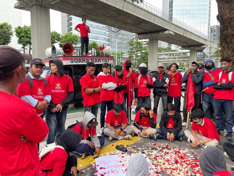Aksi tersebut diakhiri dengan Teatrikal dimana masa aksi menutup mulut mereka dengan lakban duduk di depan tulisan dimana hukum di Indonesia bisa dibeli pejabat yang punya kepentingan, sementara beberapa masa aksi lainnya menaburkan bunga tabur dan air mawar menyatakan Hukum di Indonesia sudah Mati.