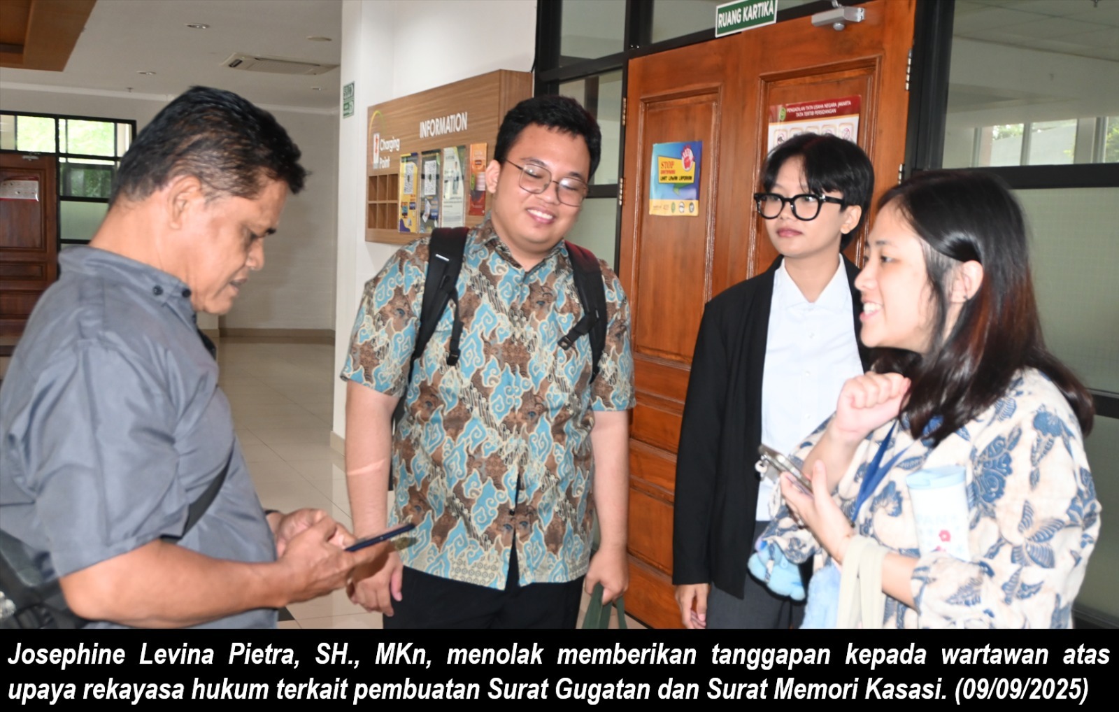 Usai sidang, kuasa hukum Penggugat, Josephine Levina Pietra, yang hadir didampingi dua orang magang, menolak memberikan tanggapan kepada wartawan yang menanyakan upaya rekayasa hukum terkait pembuatan Surat Gugatan Perkara 212/G/2025/PTUN.JKT dan Surat Memori Kasasi Perkara No. 2070 K/PDT/2025. Padahal, berdasarkan fakta, kedua dokumen tersebut dibuat dan ditandatangani olehnya bersama Filipus Arya Sembadastyo.