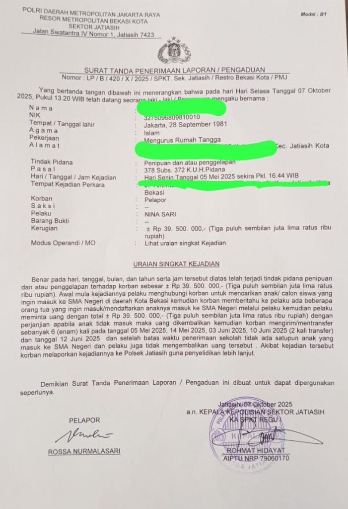 Kasus penipuan dan penggelapan yang diduga dilakukan seorang pekerja Tata Usaha SMAN 6 berinisial (NS) dengan modus pemasukan calon murid diberbagai sekolah menengah (SMA) di kota Bekasi. Diketahui para walimurid yg menjadi korban dirugikan sejumlah uangnya memberikan kuasa kepada saudari RN yang akhirnya membawa permasalahan perbuatan melawan hukum saudari (NS) ketingkat laporan pengaduan dengan nomor LP/B/420/X/2025/SPKT. Sek. Jatiasih. Restro Bekasi Kota / PMJ Selasa. 07-10-2025.