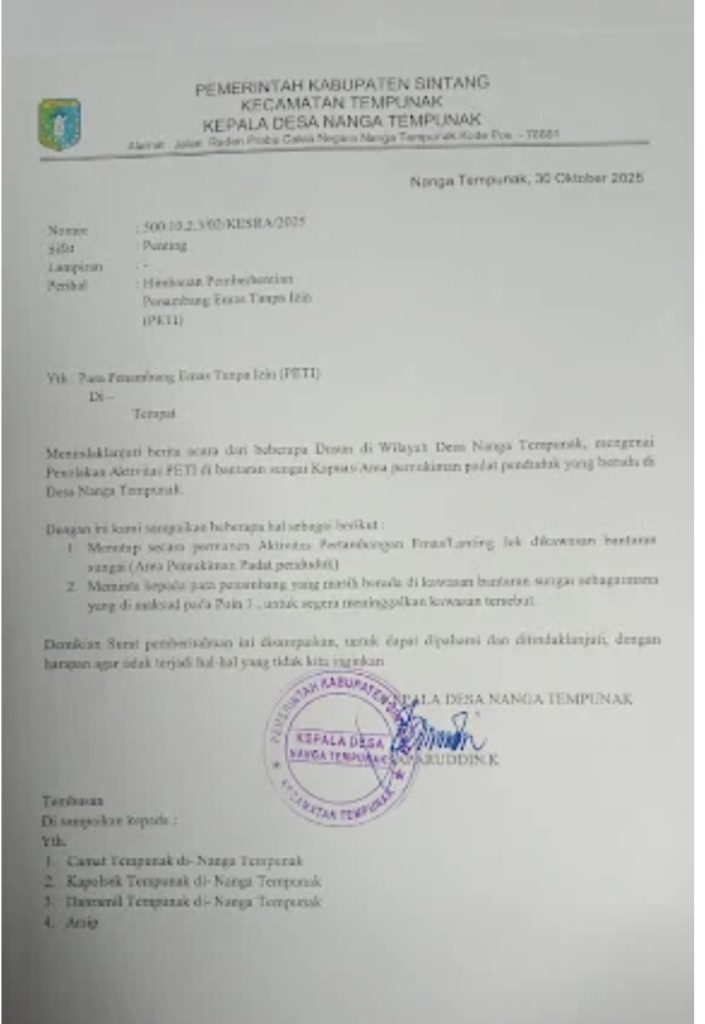 Kegiatan PETI di Depan Polsek Tempunak tersebut menurut informasi Hadi Mulyani bahwa peti di depan mapolsek tempunak telah lama beroperasi tidak ada tindakan dari aparat penegak Hukum Sintang, bahkan dari informasi dilapangan Kapolsek Tempunak telah menyampaikan informasi kegiatan peti di wilayahnya ke Polres sintang Namun para pekerja masih beroperasi dengan santai”, kata Hadi.